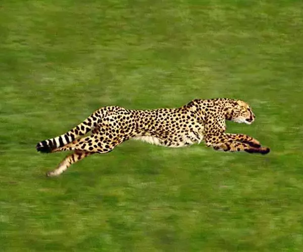 腿长,身体瘦,脊椎骨十分柔软,容易弯曲,像一根大弹簧一样,跑起来的时候前肢和后肢都在用力,而且身体也在奔跑中间一起一伏;在急转弯时,大尾巴可以起到平衡的作用,不至于摔倒。身体的特殊结构使得猎豹奔跑速度极快。