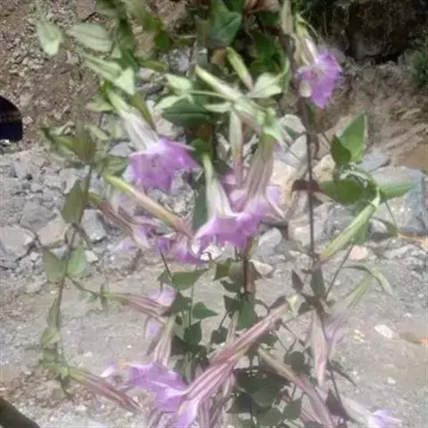 花单生枝顶,基部包于上部叶丛中;无花梗;花萼筒白色膜质,有时上部带紫红色,倒锥状筒形,长1.2-1.7厘米,裂片稍不整齐,椭圆形,长7-17毫米,先端钝,具短小尖头,边缘白色软骨质,具乳突,中脉白色软骨质,在背面突起,光滑或具乳突,弯缺宽,截形;花冠上部蓝色或蓝紫色,下部黄白色,具蓝灰色宽条纹,筒状钟形,长4-6厘米,裂片卵圆形或宽卵形,长5-6毫米,先端钝圆,具短小尖头,全缘,褶整齐,卵形,长2.5-3毫米,先端钝,全缘;雄蕊着生于冠筒中部,整齐,花丝钻形,长15-17毫米,花药狭矩圆形,长4-5毫米;子房披针形,长1.2-1.5厘米,先端渐尖,基部钝,柄粗壮,长1.7-2厘米,花柱线形,长1-1.3厘米,柱头2裂,裂片钝三角形。