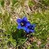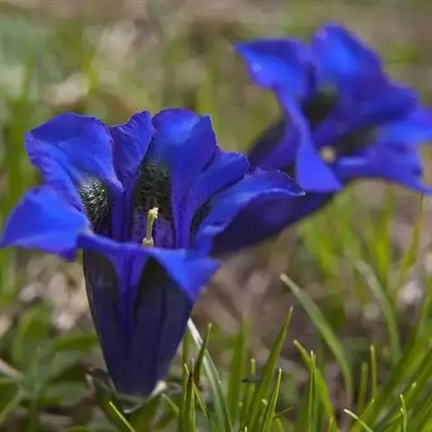 大花龙胆(Gentiana szechenyii Kanitz)多年生草本,高5-7厘米。主根粗大,圆柱形,具多数略肉质的须根。花枝数个丛生,较短,黄绿色,光滑。叶常对折,边缘白色软骨质,密被乳突,中脉白色软骨质,在两面均明显,叶柄白色膜质,光滑;莲座丛叶剑状披针形,茎生叶密集。花单生枝顶,基部包于上部叶丛中;无花梗;花萼筒白色膜质,有时上部带紫红色,倒锥状筒形,长1.2-1.7厘米,裂片稍不整齐,椭圆形。花冠筒状钟形,上部蓝色或蓝紫色,下部黄白色,裂片卵圆形。蒴果内藏,狭椭圆形,先端渐尖,基部钝,柄粗壮;种子深褐色,矩圆形,表面具浅蜂窝状网隙。花果期6-11月。