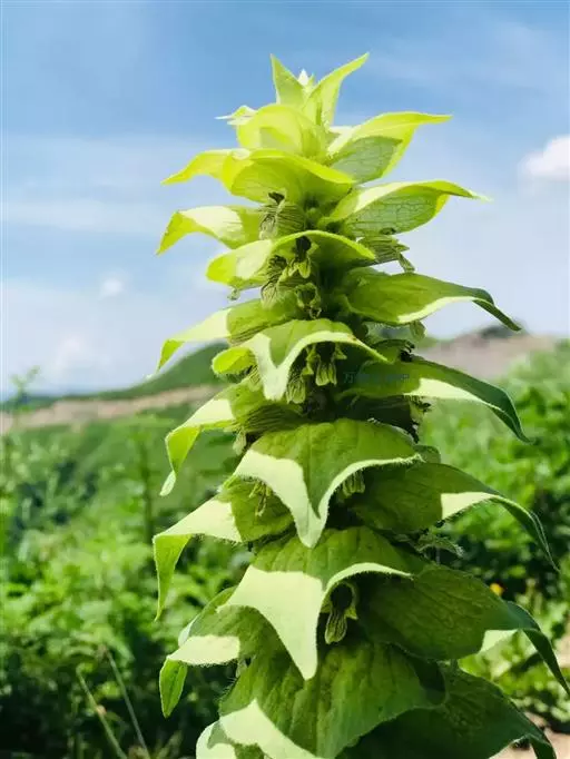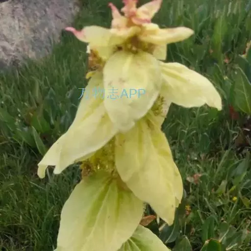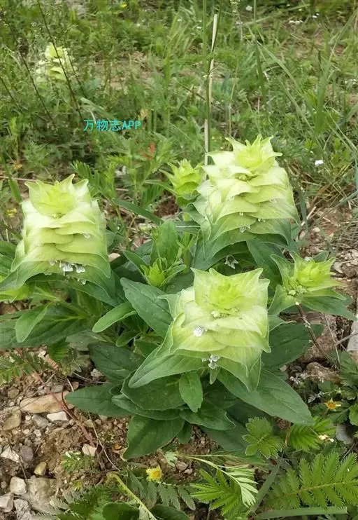 多年生草本,具地下走茎。茎粗壮,直立,高18-25厘米,四棱形,具槽,沿棱及节上被白色具节长柔毛。叶柄具狭翅,基部抱茎,边缘具缘毛;叶片纸质,披针状长圆形,长5-11厘米,宽1.8-3厘米,先端钝或稍圆,基部楔形,下延,边缘疏生波状圆齿或几全缘,具缘毛,上面无毛或被极少的疏柔毛,下面仅叶脉被长柔毛或仅近顶端有星散疏柔毛。穗状聚伞花序由多数轮伞花序组成;苞叶大,向上渐小,白黄、白或绿紫色,卵形或阔卵形,长3.5-5厘米,宽1.8-2.7厘米,先端渐尖,基部圆形,抱轴,全缘,上面被长柔毛,下面仅叶脉或有时仅顶端被疏柔毛;花梗短,被长柔毛。花萼钟状或略呈漏斗状,长7-9毫米,基部前方略膨大,具10脉,其中5脉不甚明显,萼齿5,狭三角形,长为花萼之半或较长,整齐,先端渐尖,边缘具缘毛。花冠白、白绿或白黄色,具紫色斑纹,狭漏斗状,长1.8-2.5厘米,外面被疏长柔毛,冠筒基部前方略膨大,内面具毛环,从前方向下弯,冠檐二唇形,上唇小,直立,2裂,裂片近圆形,下唇延伸,3裂,中裂片狭扇形,长约6.5毫米,顶端微缺,侧裂片长圆形,长约3毫米。雄蕊4,二强,着生于冠筒中部,伸出,花丝细,挺直,被长柔毛或疏柔毛,花药肾形,1室。花柱无毛,伸出,较雄蕊略短,先端2浅裂,裂片细尖。花盘杯状,裂片近相等,不明显,前方微膨大。子房4裂,被长柔毛。小坚果倒卵状或倒卵长圆状三棱形,背部具网状皱纹,腹部中间微微隆起,具1大果脐,而果脐几达腹面之半。花期7-9月,果期8-10月。