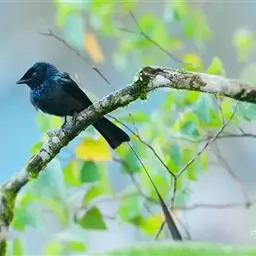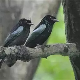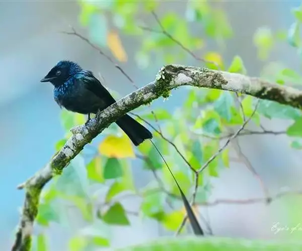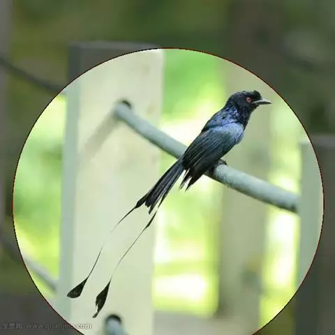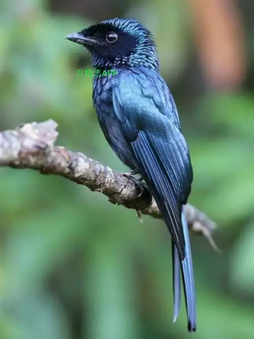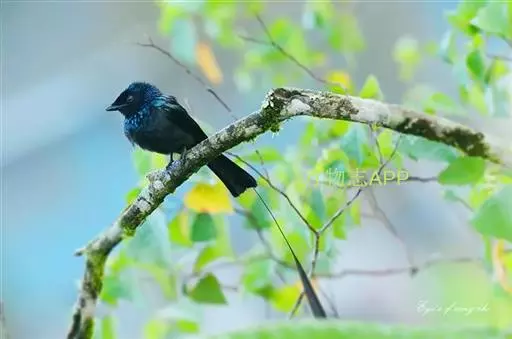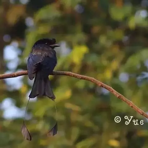 雌性成鸟体羽似雄鸟,仅金属闪光不甚显著;最外侧尾羽较雄鸟稍短。幼鸟的簇状额羽丛不发达;体羽微沾光泽;翅下覆羽及腋羽黑褐色,羽端白色斑大而显著;尾羽呈正常深叉羽端,最外侧一对尾羽不甚延长,羽干不裸出,无延伸的“盘状尾”。