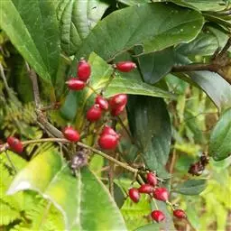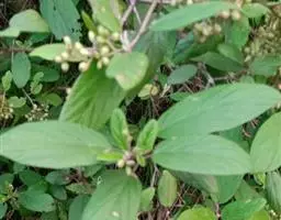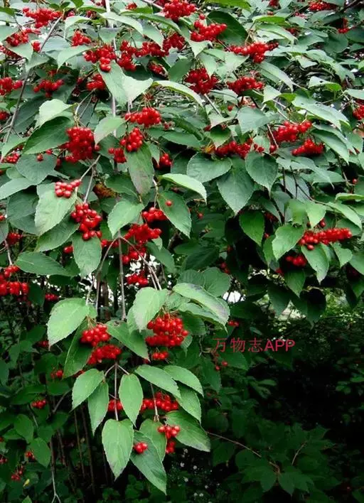 灌木或小乔木,高2~5m。幼枝紫褐色。叶对生,卵形、卵状长圆形或近菱形,长4~13cm。边缘有浅波状齿;叶柄长0.8~2.5cm。花序聚伞状复伞形;萼筒长约1.5mm,萼檐具5微齿;花冠白色,长约3mm,辐状。核果近球形,直径6~7mm,熟时红色,核扁,背具2、腹具1浅槽。