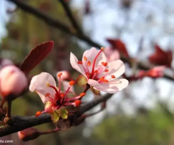 而紫叶矮樱是落叶灌木或小乔木,花单生,中等偏小,淡粉红色,花瓣5片。微香,雄蕊多数,单雌蕊,花期4-5月。