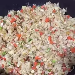 9、下入米饭,转大火快速翻炒,边翻炒边颠锅,开始时米饭 发粘;