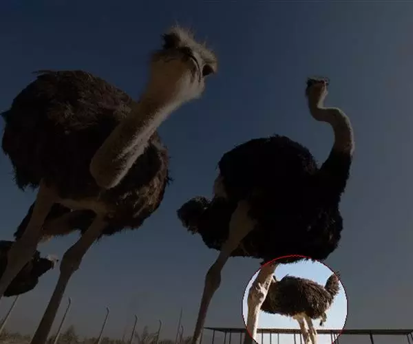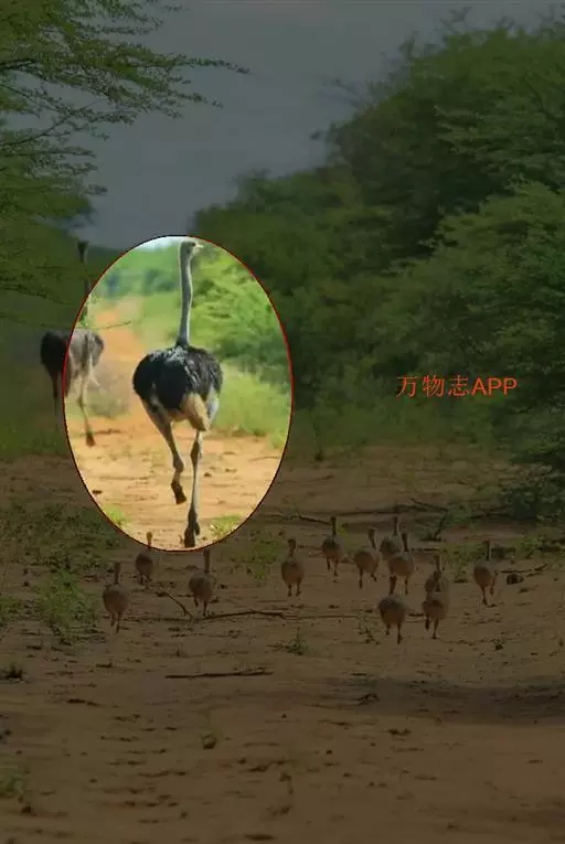 鸵鸟的祖先也是一种会飞的鸟类,它是怎么变成今天的模样,这与它的生活环境有着非常密切的关系。鸵鸟是一种原始的残存鸟类,它代表着在开阔草原和荒漠环境中动物逐渐向高大和善跑方向发展的一种进化方向。与此同时,飞行能力逐渐减弱直至丧失。非洲鸵鸟的奔跑能力是十分惊人的。它的足趾因适于奔跑而趋向减少,是世界上唯一只有两个脚趾的鸟类,而且外脚趾较小,内脚趾特别发达。它跳跃可腾空2.5米,冲刺速度在每小时70公里以上。同时粗壮的双腿还是非洲鸵鸟的主要防卫武器,甚至可以致狮,豹于死地。