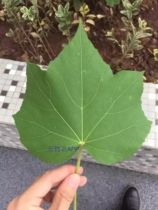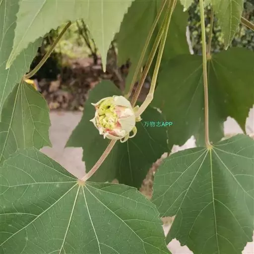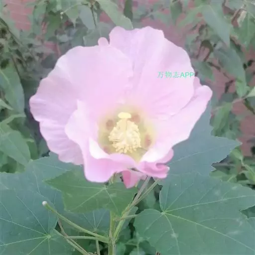 木芙蓉 木芙蓉(原变型)为落叶灌木或小乔木,高2-5米;小枝、叶柄、花梗和花萼均密被星状毛与直毛相混的细绵毛。叶宽卵形至圆卵形或心形,直径10-15厘米,常5-7裂,裂片三角形,先端渐尖,具钝圆锯齿,上面疏被星状细毛和点,下面密被星状细绒毛;主脉7-11条;叶柄长5-20厘米;托叶披针形,长5-8毫米,常早落。