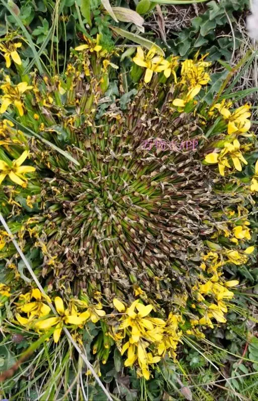 多年生草本。根长,垂直直伸,倒圆锥状。茎极短或几无茎,高1-8厘米。叶稠密,集中排列在团伞花序下部,线形或长椭圆形,长1-2厘米,宽1-4毫米,皱波状羽状浅裂或深裂,叶柄宽扁,长达1厘米,叶柄与叶片被稀疏或稠密的长硬毛,极少无毛。头状花序多数在茎端排成团伞状花序,团伞花序直径2-9厘米,花序梗长5毫米。总苞狭圆柱状,直径2毫米;总苞片2层,外层2枚,线形,紧靠内层,长6-12毫米,被稀疏的长或短硬毛;内层总苞片4枚,近等长,长椭圆形,长约7毫米,宽约1.5毫米,顶端钝或圆形,外面有稀疏长柔毛或无毛。舌状小花黄色,4枚。瘦果长倒圆锥状,微压扁,下部收窄,顶端截形,长2.5毫米,有17条粗细不等的纵肋。冠毛鼠灰色或浅黄色,长约8毫米,细锯齿状。花果期7-8月。