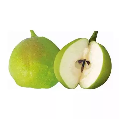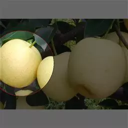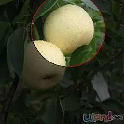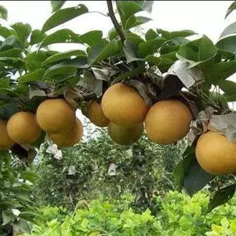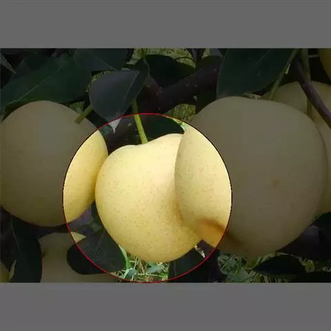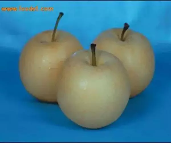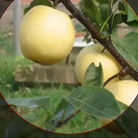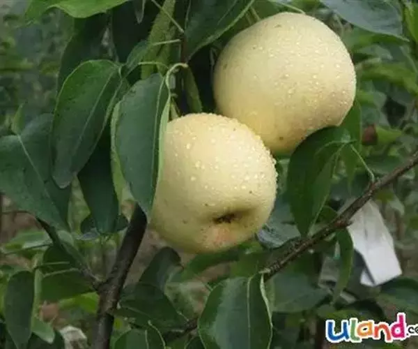 果实性状:果实近圆形或稍扁,平均单果重250克,大果重500克。不套袋果果皮黄绿色,贮藏后变为金黄色。套袋果果皮淡黄色,果面洁净,果点小而稀。果肉白色,肉质脆嫩,多汁,石细胞少,果心极小,可食率达95%以上,不套袋果可溶性固形物含量14%~16%,套袋果12%~15%,风味甜。果实9月中下旬成熟,果实发育期129天左右。较耐贮藏。
