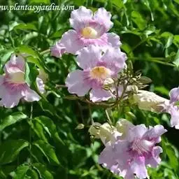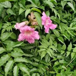 粉花凌霄 K.Schum.)是紫葳科魔盒凌霄属的落叶藤本植物。奇数羽状复叶对生,小叶全缘,…