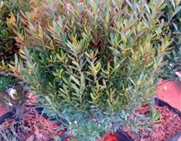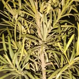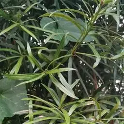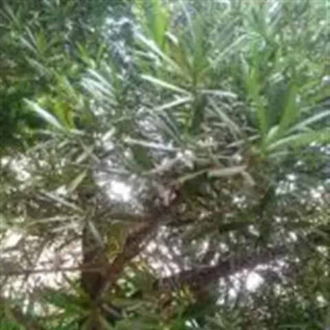 灌木,高1-3米;小枝较粗。叶密生或疏生,窄矩圆形或矩圆状条形,稀椭圆状披针形,质地厚、革质,长5-8厘米,宽9-13毫米,先端钝或微圆,稀尖,基部窄,上面深绿色,中脉隆起,下面微具白粉,呈灰绿色,中脉微隆起或平,叶柄短,长约2毫米。