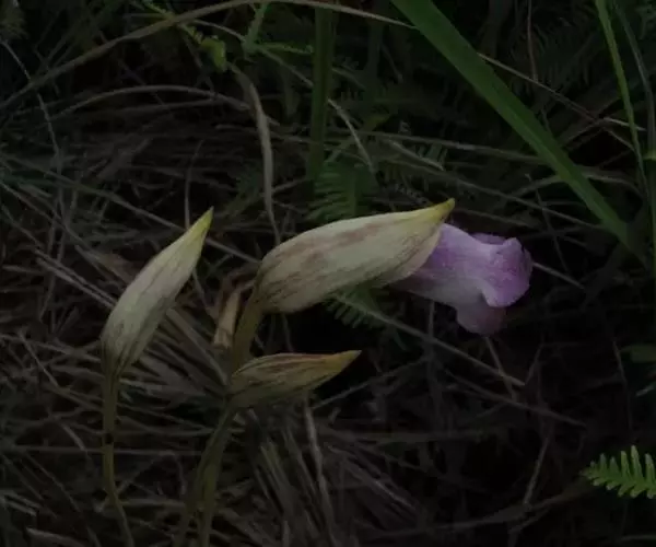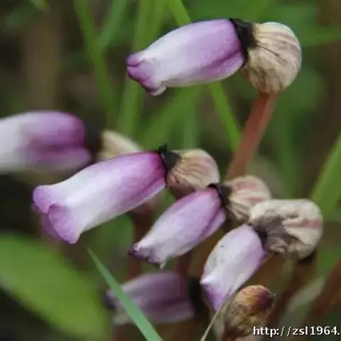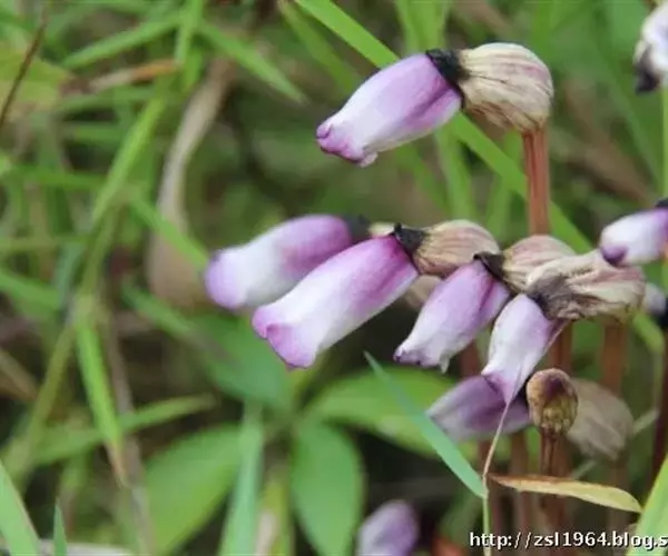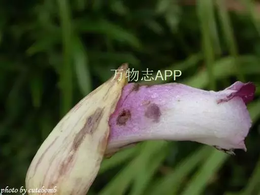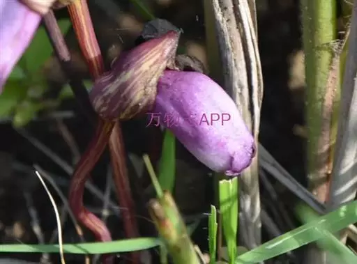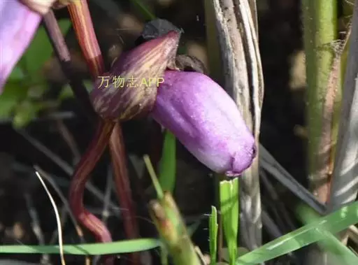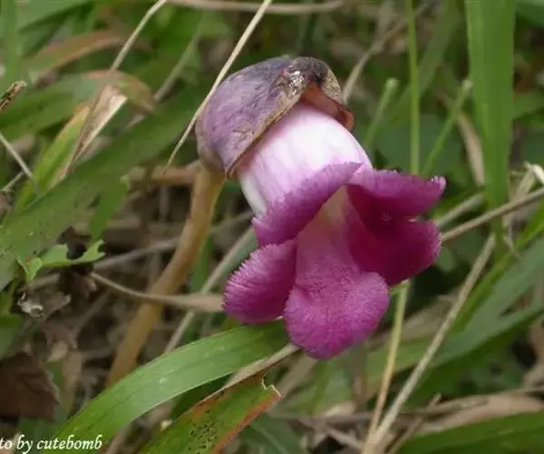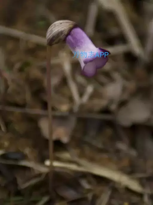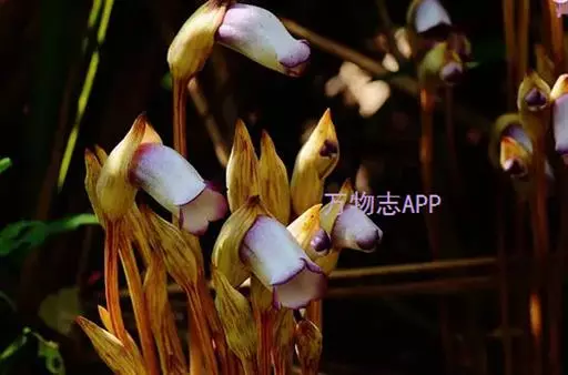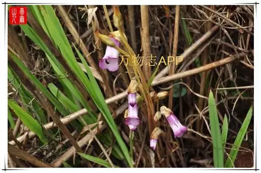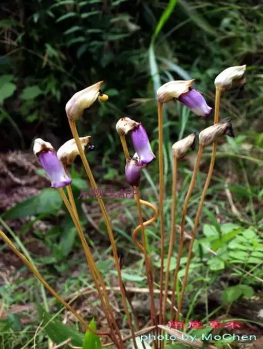 一年生寄生草本,高15-40(-50)cm。根稍肉质,具树状细小分枝。茎黄褐色或紫红色,不分枝或自近基部处有分枝,偶尔自中部以上分枝。叶肉红色,卵状披针形或披针形,长5-10mm,宽3-4mm,两面光滑无毛。花常单生茎端,稍俯垂。花梗粗壮,常直立,长10-30(-40)cm,直径约3mm,无毛,常具紫红色的条纹。花萼一侧裂开至近基部,长2.5-4.5(-6.5)cm,紫红色、黄色或黄白色,具紫红色条纹,先端急尖或渐尖,两面无毛。花冠带粘液,常与花萼同色,或有时下部白色,上部带紫色,凋谢后变绿黑色,干时变黑色,长4-6cm,不明显的二唇形,筒部宽,稍弯曲,在花丝着生处变窄,顶端5浅裂,上唇裂片和下唇的侧裂片较短,近圆形,全缘,下唇中间裂片稍大。雄蕊4枚,内藏,花丝着生于距筒基部1.4-1.5cm处,长7-9mm,紫色,无毛,花药黄色,有粘液,成对粘合,仅1室发育,下方一对雄蕊的药隔基部延长成距。子房1室,侧膜胎座4个,横切面有极多分枝,花柱无毛,长1-1.5cm,柱头膨大,肉质,淡黄色,盾状。蒴果圆锥状或长卵球形,长约2-3cm,2瓣开裂。种子多数,细小,椭圆形,黄色,长约0.04mm,种皮网状。花期4-8月,果期8-10月。