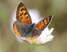 橙灰蝶Lycaena dispar Hauorth,鳞翅目、灰蝶科。这类蝴蝶雌雄异型,雄蝶前翅翅面…