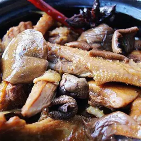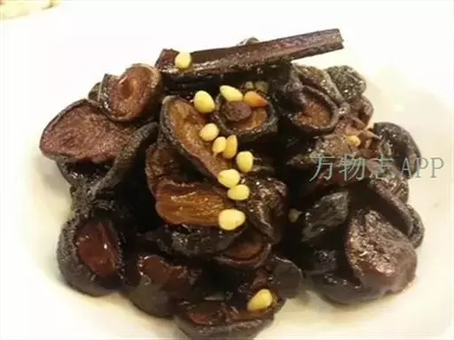 3.锅留余油,下甜面酱略微煸炒,放白糖,酱油,盐,投入香菇不断翻炒,再加适量清水,用大火烧开,改用中火烧透,下味精,再下松仁翻炒, 收干卤汁,放香油,起锅装盘,冷却后食用。