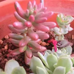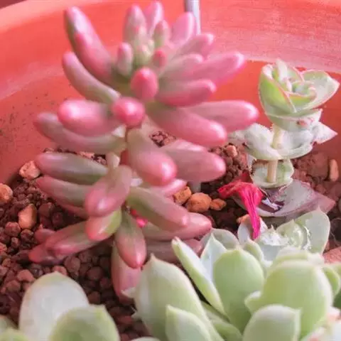 灯美人是景天科的园艺品种,多肉植物。叶片近柱状,丛生,在日照时间长、温差大的环境下会呈现橙粉色。