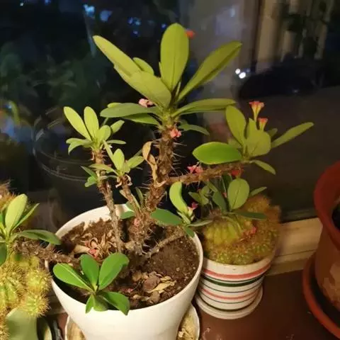 虎刺梅:别称铁海棠,是蔓生灌木植物。茎多分枝,长60-100厘米,直径5-10毫米,具纵棱,密生硬…