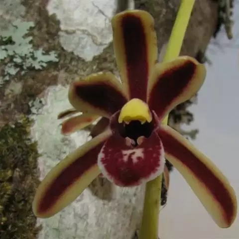 大序隔距兰 Garay):茎直立,扁圆柱形,伸长,达20余厘米,通常粗5-8毫米,被叶鞘所包,…