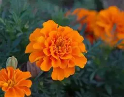 万寿菊是菊科万寿菊属一年生草本植物,别名孔雀菊、缎子花、臭菊花、西番菊、红黄草、小万寿菊、臭芙蓉、孔雀草。万寿菊茎近基部分枝。叶羽状分裂,长5-10厘米,宽4-8厘米,裂片长椭圆形或披针形,具锐齿,上部叶裂片齿端有长细芒,叶缘有少数腺体。头状花序单生,径5-8厘米,花序梗顶端棍棒状。总苞长1.8-2厘米,径1-1.5厘米,杯状,顶端具尖齿。舌状花黄或暗橙黄色,长2.9厘米,舌片倒卵形,长1.4厘米,基部成长爪,先端微弯缺。管状花花冠黄色,长约9毫米,冠檐5齿裂。瘦果线形,被微毛;冠毛有1-2长芒和2-3短而钝鳞片。花期7-9月。万寿菊中国各地均有栽培,在广东和云南南部、东南部已归化,国外原产墨西哥。万寿菊对土壤要求不严,但以肥沃疏松排水良好的土壤为好。耐移栽,种子发芽适温21-24℃,植株生长适合温度为20-29℃。喜温暖和阳光充足的环境,不