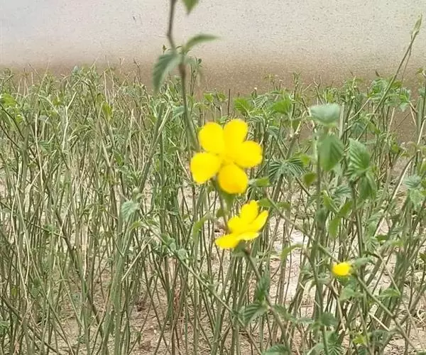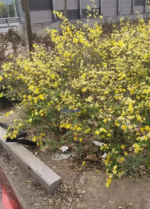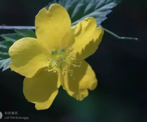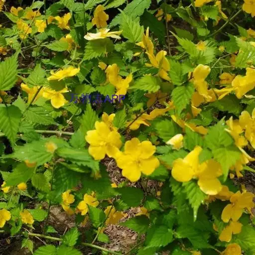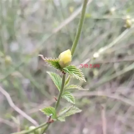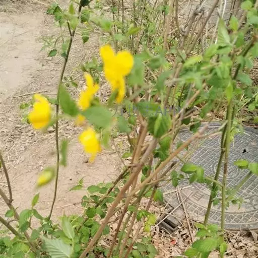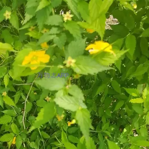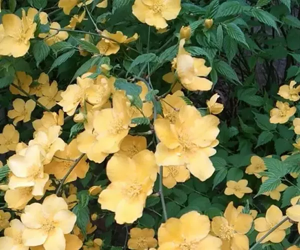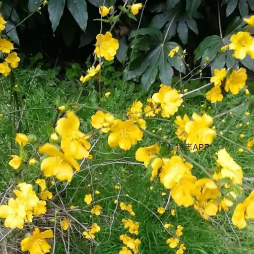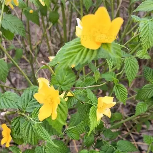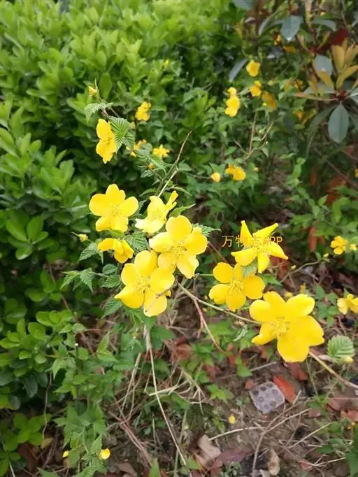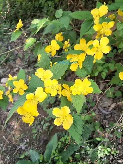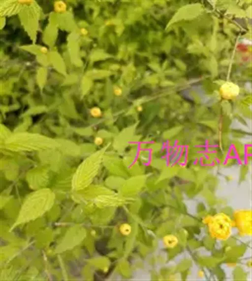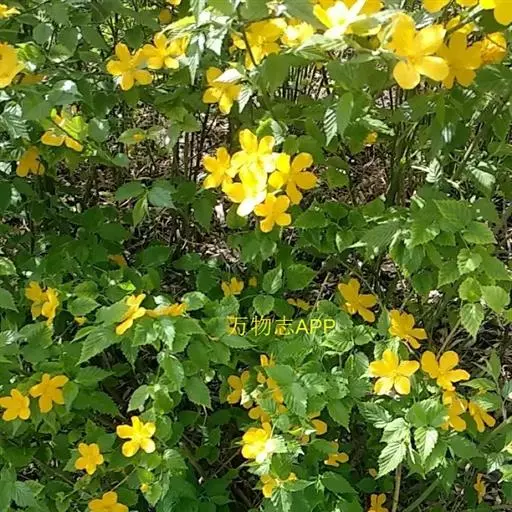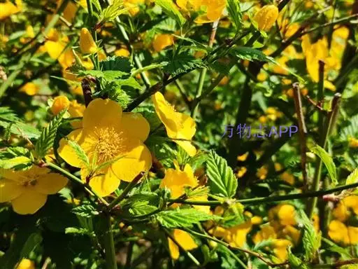 棣棠花(学名:Kerria japonica (L.) DC.):灌木,高1-2米;小枝有棱,绿色,无毛。叶卵形或三角形,先端渐尖,基部截形或近圆形,边缘有重锯齿,上面无毛或有稀疏短柔毛,下面微生短柔毛;叶柄无毛;有托叶。花单生于侧枝顶端;无毛;花直么3-5厘米;萼筒扁平,裂片5,卵形,全缘,无毛;花瓣黄色,宽椭圆形;雄蕊多数,离生,长约花瓣之半;心皮5-8,有柔毛,花柱约与雄蕊等到长。瘦查黑色,无毛,萼裂片宿存。