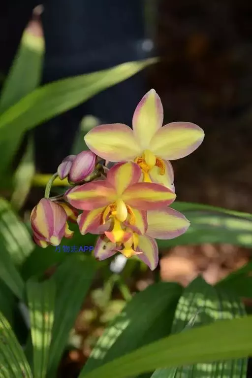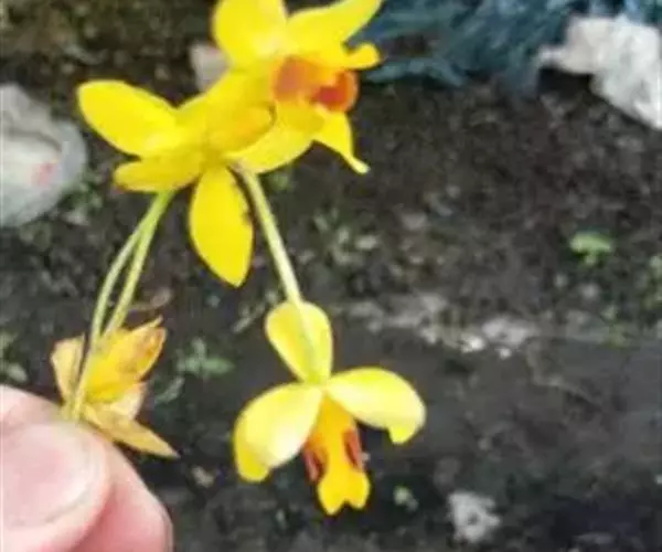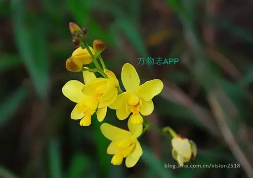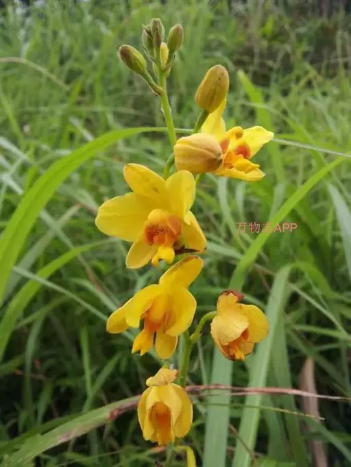 苞舌兰(学名:Spathoglottis pubescens Lindl.):假鳞茎扁球形,通常粗1-2.5厘米,被革质鳞片状鞘,顶生1-3枚叶。叶带状或狭披针形,两面无毛。花葶纤细或粗壮,长达50厘米,密布柔毛,下部被数枚紧抱于花序柄的筒状鞘;总状花序长2-9厘米,疏生2-8朵花;花黄色;萼片椭圆形,具7条脉,背面被柔毛;花瓣宽长圆形,与萼片等长,宽9-10毫米,先端钝,具5-6条主脉,外侧的主脉分枝,两面无毛;唇瓣约等长于花瓣,3裂。花期7-10月。