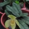 苞舌兰假鳞茎扁球形,通常粗1-2.5厘米,被革质鳞片状鞘,顶生1-3枚叶。叶带状或狭披针形,长达43厘米,宽1-1.7(-4-5)厘米,先端渐尖,基部收窄为细柄,两面无毛。