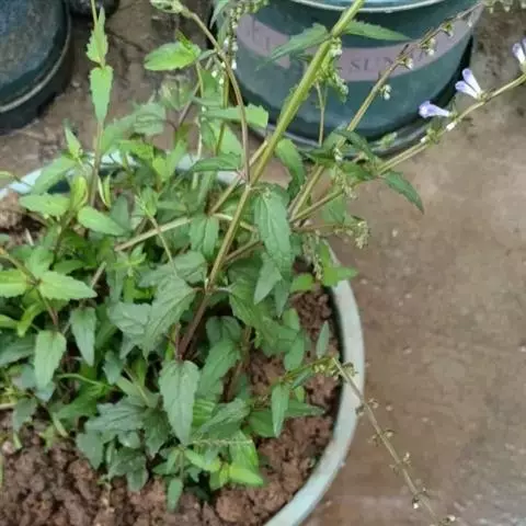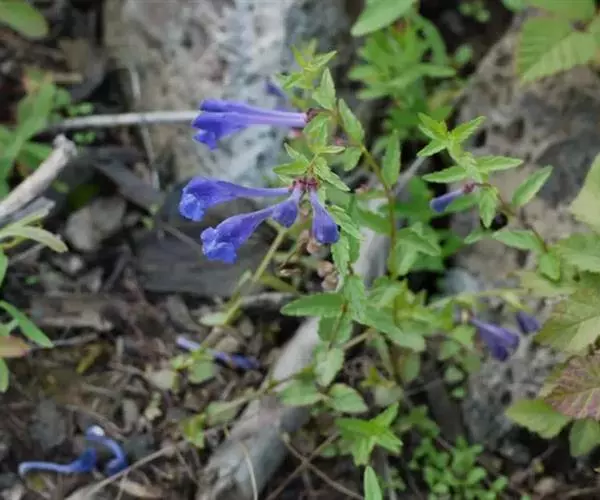 根茎斜行或近直伸,节上生须根。茎直立,高12-36厘米,四棱形,基部粗1-2毫米,常带紫色,在棱上疏被上曲的微柔毛,或几无毛,不分枝,或具或多或少或长或短的分枝。叶具很短的柄或近无柄,柄长1-3毫米,腹凹背凸,被小柔毛;叶片三角状狭卵形,三角状卵形,或披针形,长1.5-3.8厘米,宽0.4-1.4厘米,先端大多钝,稀微尖,基部浅心形,近截形,边缘大多具浅锐牙齿,稀生少数不明显的波状齿,极少近全缘,上面绿色,无毛,下面较淡,沿中脉及侧脉疏被小柔毛,有时几无毛,具多数凹点,有时有不具凹点,侧脉约3对,上面凹陷,下面明显凸起。花单生于茎上部的叶腋内,偏向一侧;花梗长2-4毫米,被短柔毛,近基部有一对长约1毫米的针状小苞片。花萼开花时长3-4毫米,被短柔毛及缘毛,盾片高约1毫米,果时花萼长4.5毫米,盾片高2毫米。花冠蓝紫色,长2-2.2厘米,外面被短柔毛,内面无毛;冠筒基部浅囊状膝曲,宽约2毫米,向上渐宽,至喉部宽达6.5毫米;冠檐2唇形,上唇盔状,内凹,先端微缺,下唇中裂片圆状卵圆形,先端微缺,最宽处7毫米,2侧裂片卵圆形,先端微缺,宽2.5毫米。雄蕊4,均内藏,前对较长,具能育半药,退化半药明显,后对较短,具全药,药室裂口具髯毛;花丝扁平,前对内侧后对两侧下部被疏柔毛。花柱细长,先端锐尖,微裂。花盘前方隆起,后方延伸成短子房柄。子房4裂,裂片等大。小坚果黑色,椭圆形,长1.5毫米,径1毫米,具瘤状突起,腹面近基部具果脐。花期6-8月,果期8-9月。