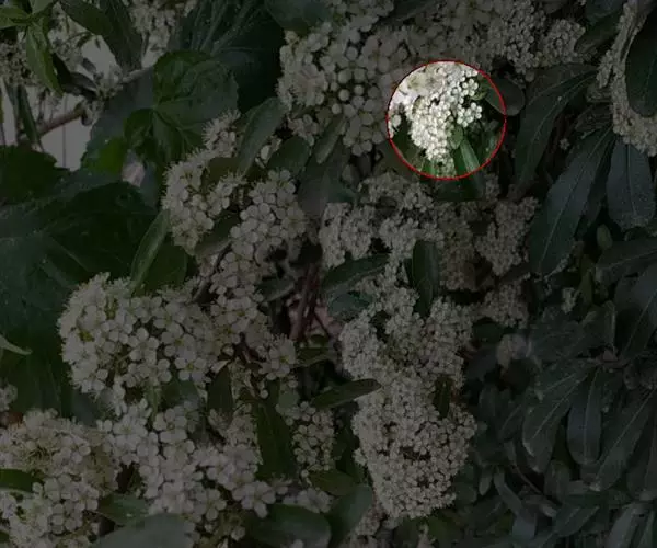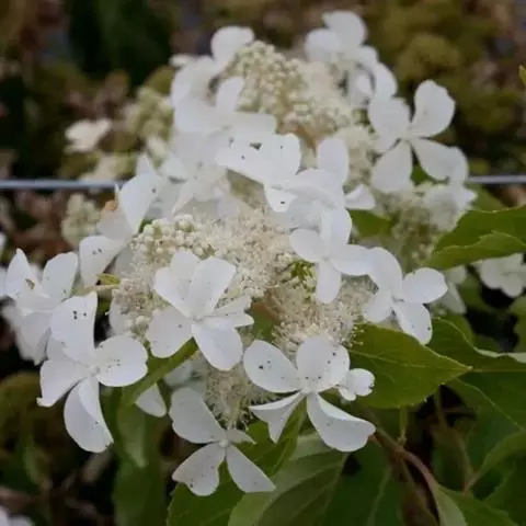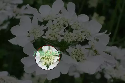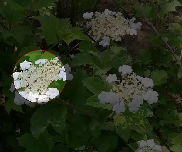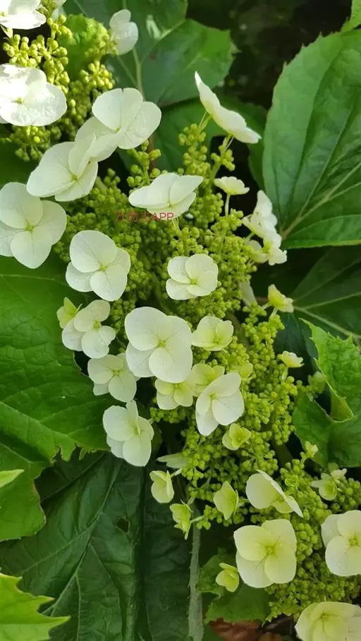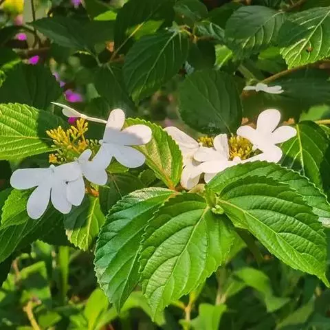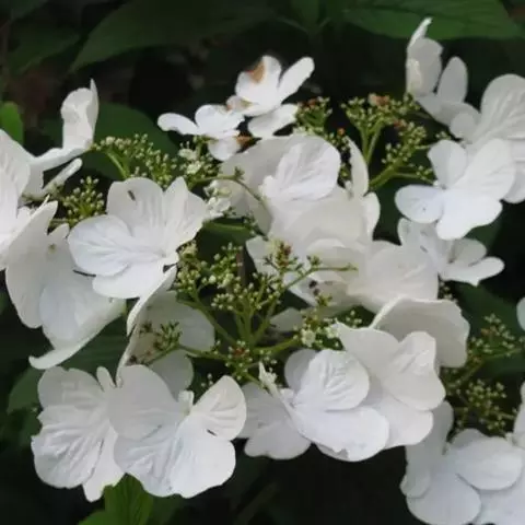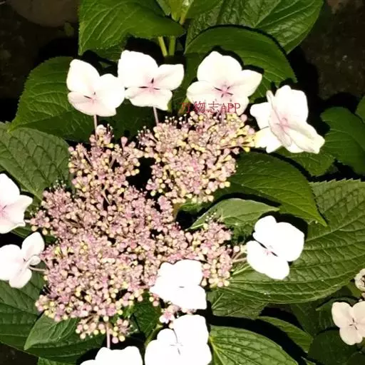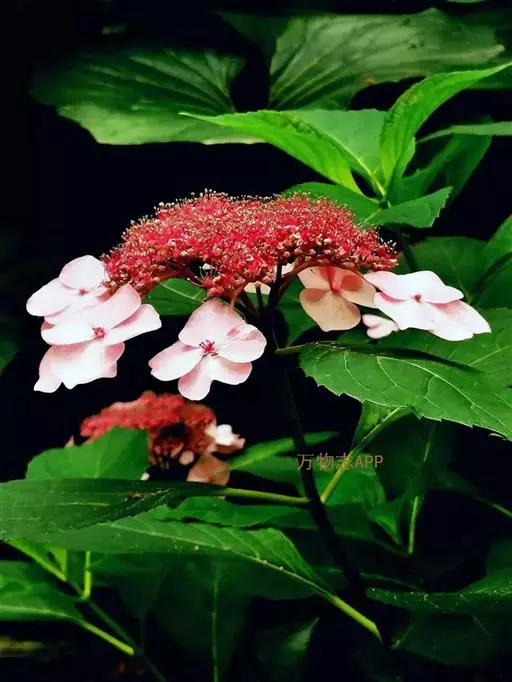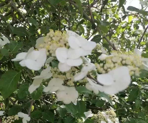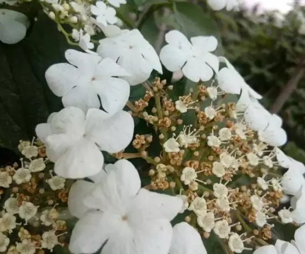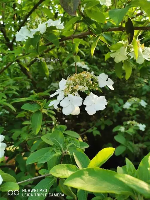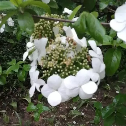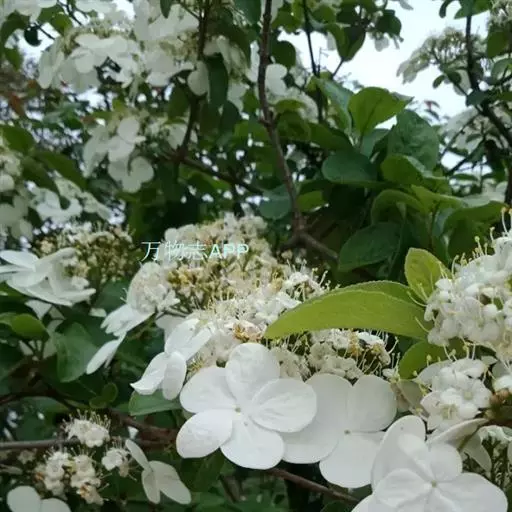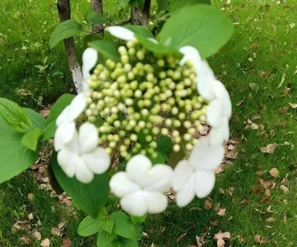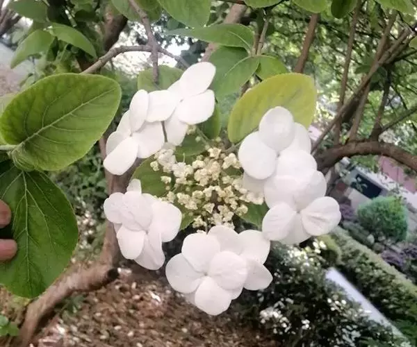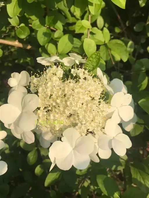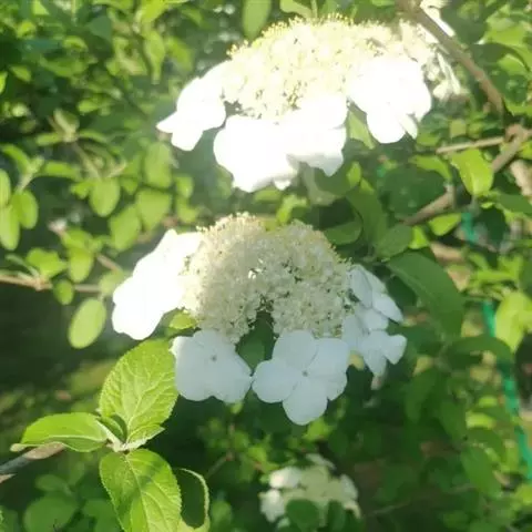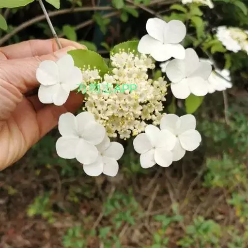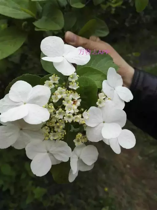 聚伞花序直径8-15厘米,全部由大型不孕花组成,总花梗长1-2厘米,第一级辐射枝5条,花生于第三级辐射枝上;萼筒筒状,长约2.5毫米,宽约1毫米,无毛,萼齿与萼筒几等长,矩圆形,顶钝;花冠白色,辐状,直径1.5-4厘米,裂片圆状倒卵形,筒部甚短;雄蕊长约3毫米,花药小,近圆形;雌蕊不育。花期4-5月。
