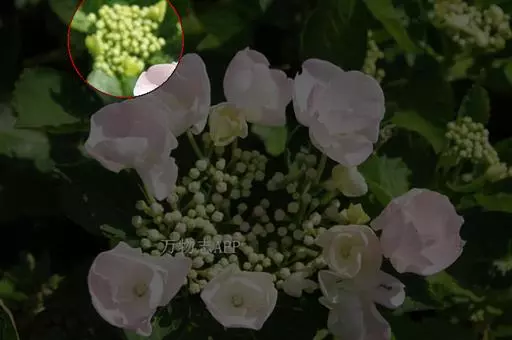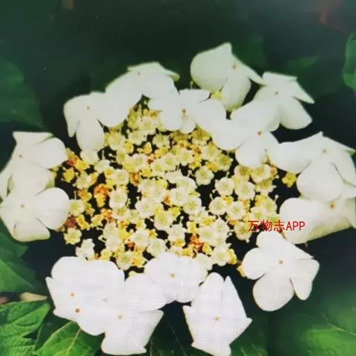 琼花(琼花集)聚八仙(洪武郡志);八仙花(花镜),蝴蝶木(拉汉种子植物名称),扬州琼花(博物)聚伞花序仅周围具大型的不孕花,花冠直径3-4.2厘米,裂片倒卵形或近圆形,顶端常凹缺;可孕花的萼齿卵形,长约1毫米,花冠白色,辐状,直径7-10毫米,裂片宽卵形,长约2.5毫米,筒部长约1.5毫米,雄蕊稍高出花冠,花药近圆形,长约1毫米。