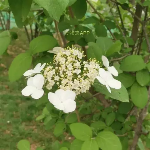 绣球荚蒾(原变型)落叶或半常绿灌木,高达4米;树皮灰褐色或灰白色;芽、幼枝、叶柄及花序呈灰白色或黄白色簇状短毛,后渐变无毛。叶临冬至翌年春季逐渐落尽。纸质,卵形至椭圆形或卵状矩圆形,长5-11厘米,顶端钝或稍尖,基部圆或有时微心形,边缘有小齿,上面初时密被簇状短毛,后仅中脉有毛,下面被簇状短毛,侧脉5-6对,近缘前互相网结,连同中脉上面略凹陷,下面凸起;叶柄长10-15毫米。