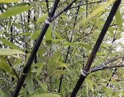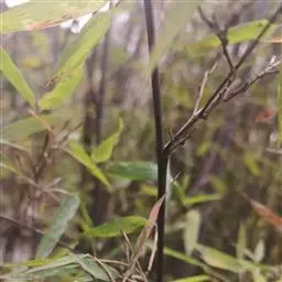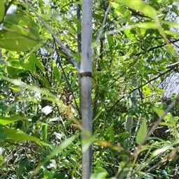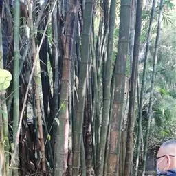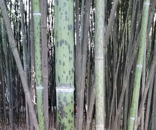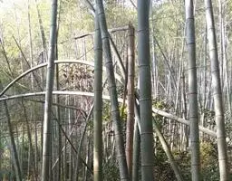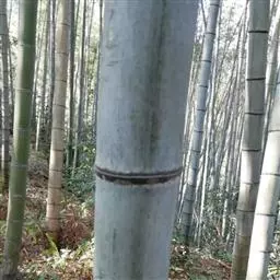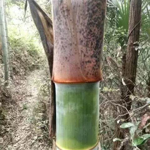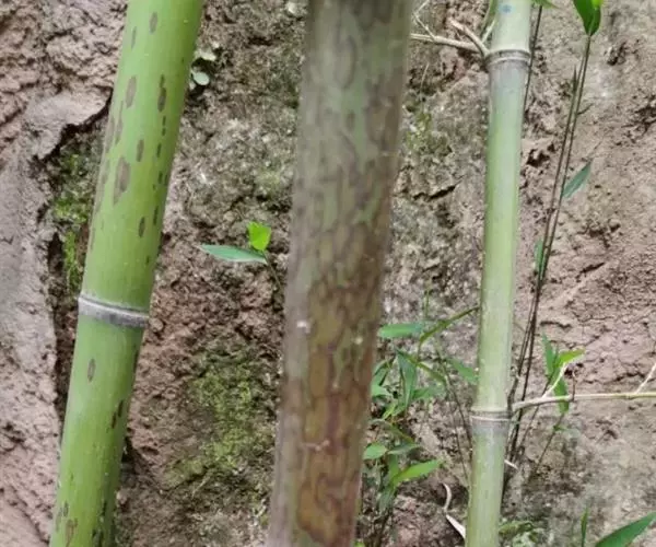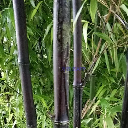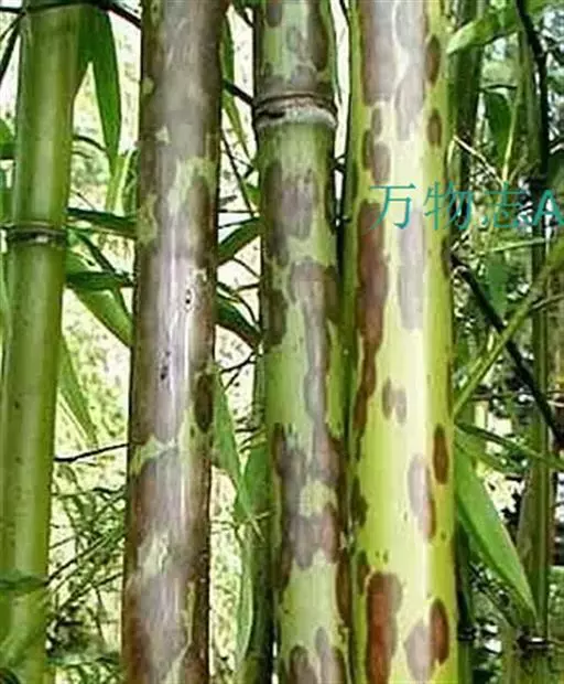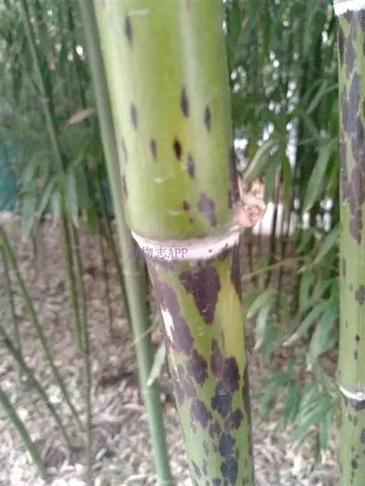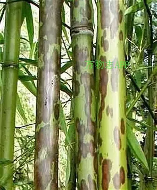 斑竹 乔木或灌木状竹类。 竿高可达20米,粗达15厘米,幼竿无毛,无白粉或被不易察觉的白粉,偶可在节下方具稍明显的白粉环;节间长达40厘米,壁厚约5毫米;竿环稍高于箨环。