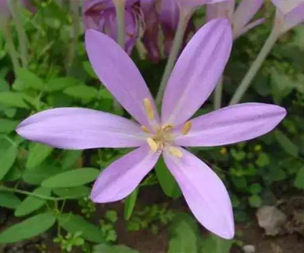 多年生草本植物。地下部分也具有圆球形的鳞茎。它的这种鳞茎,有的直径可长至6厘米以上。 球根花卉,球茎卵形,外皮黑褐色。茎极短,大部理于地下。叶披针形,暗绿色,长约30厘米。每开花1-4朵,花纺形,开放时漏斗形,淡粉红色(或紫红色),直径约7-8厘米:雄蕊比雌蕊短,花药黄色。蒴果,种子多数,呈不规则的球形,褐色。8-10月开花,翌年春天长叶。