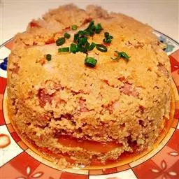 1.将花生仁放进容器中,加沸水(略放盐少许)泡10分钟后剥皮,投入六成热的油锅中炸至熟脆捞出,待冷却后将它碾成碎末。另将比目鱼干剔尽骨刺,也用(七成)热的油锅炸酥捞出,斩成细末待用。