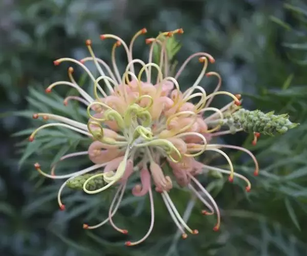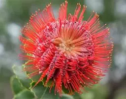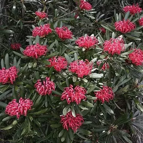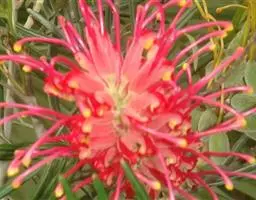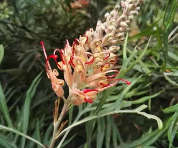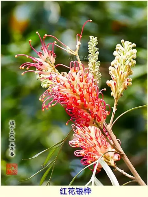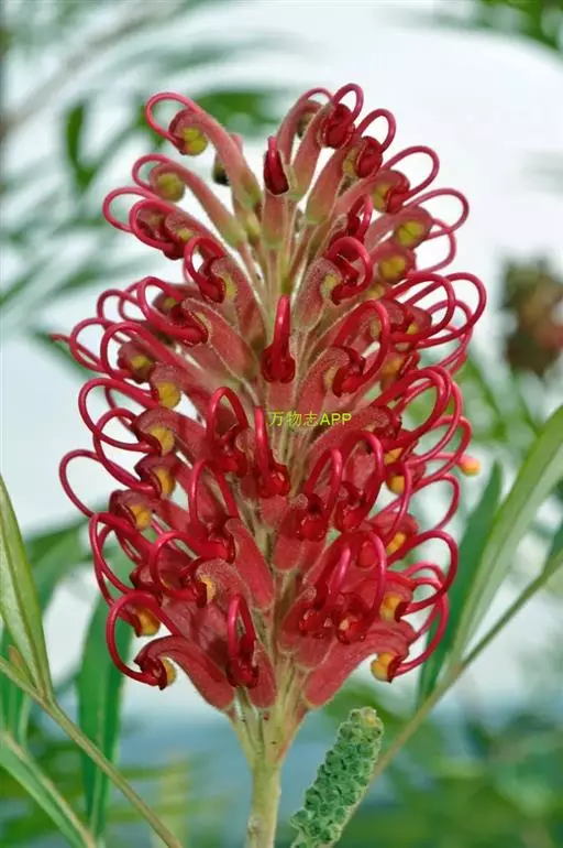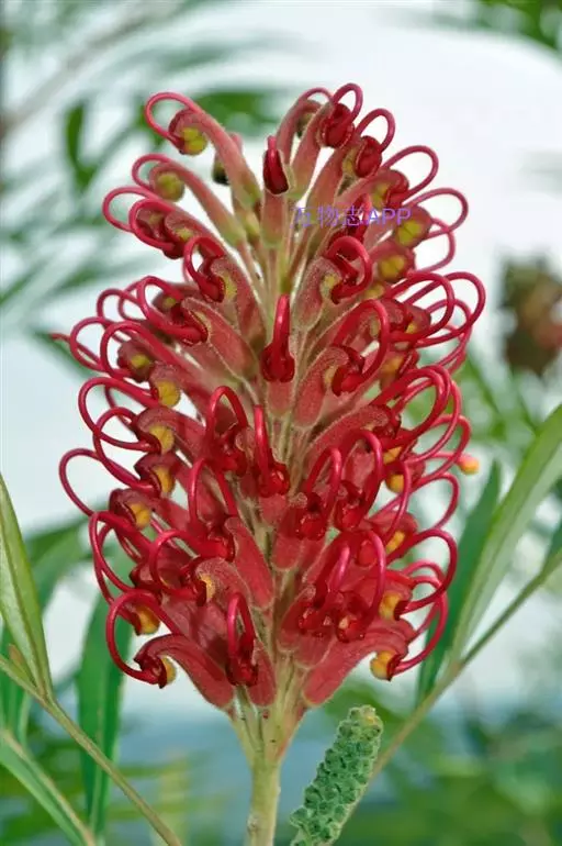 常绿乔木,树高4-8米,胸径达15-18厘米。树干端直,树冠圆锥形,树皮黑褐色,呈不规则的浅纵裂,幼枝、嫩芽及叶柄上密被锈褐色或灰褐色粗毛,单叶互生,二回羽状深裂,裂片5-12对,近披针形,叶面深绿色,中脉下陷,叶背被褐色绒毛与银灰色绢毛,总状花序,花两性,似大型的毛刷生于枝顶,花冠呈简状,雄蕊花柱伸出花冠筒外,先端弯曲,花亮红,密集。