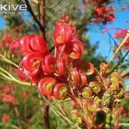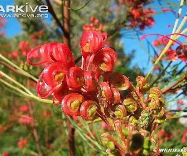 红花银桦(学名:Grevillea banksii R.Br.)是山龙眼科银桦属植物,常绿乔木,树高4-8米,胸径达15-18厘米。树干端直,树冠圆锥形,树皮黑褐色,呈不规则的浅纵裂,幼枝、嫩芽及叶柄上密被锈褐色或灰褐色粗毛,单叶互生,叶背被褐色绒毛与银灰色绢毛,总状花序,花两性。