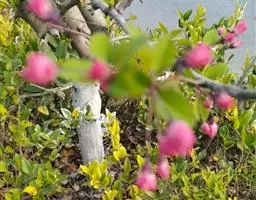 贴梗海棠 落叶灌木或小乔木,高达7米,无枝刺;小枝圆柱形,紫红色,幼时被淡黄色绒毛;树皮片状脱落,落后痕迹显著。叶片椭圆形或椭圆状长圆形,长5-9厘米,宽3-6厘米,先端急尖,基部楔形或近圆形,边缘具刺芒状细锯齿,齿端具腺体,表面无毛,幼时沿叶脉被稀疏柔毛,背面幼时密被黄白色绒毛;叶柄粗壮,长1-1.5厘米,被黄白色绒毛,上面两侧具棒状腺体;托叶膜质,椭圆状披针形,长7-15毫米,先端渐尖,边缘具腺齿,沿叶脉被柔毛。花单生于短枝端,直径2.5-3厘米;花梗粗短,长5-10毫米,无毛;萼筒外面无毛;萼裂片三角状披针形,长约7毫米,先端长渐尖,边缘具稀疏腺齿,外面无毛或被稀疏柔毛,内面密被浅褐色绒毛,较萼筒长,果时反折;花瓣倒卵形,淡红色;雄蕊长约5毫米;花柱长约6毫米,被柔毛。梨果长椭圆体形,长10-15厘米,深黄色,具光泽,果肉木质,味微酸、涩,有芳香,具短果梗。花期4月,果期9-10月。