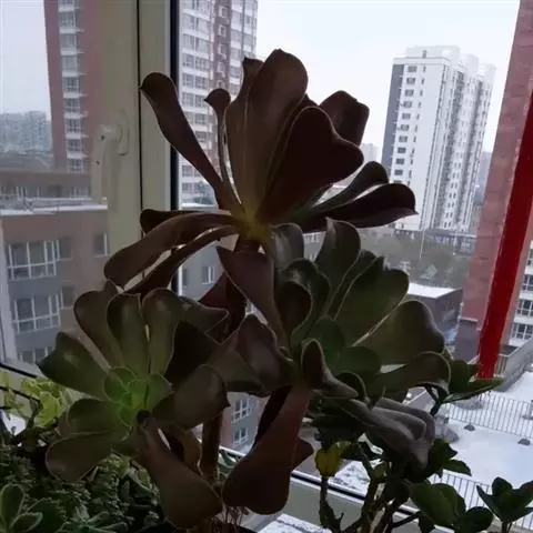 黑法师夏季休眠同一般的景天一样,需要多加注意,此时是景天科死亡率最高的时候,此时的护理需要慢慢减少水量,直至断水,不能暴晒,放在散射光好的地方,可以晚上将土打湿,但是要保证第二天土能干掉,此时要注意通风。一般黑法师在温度超过30度,低于5℃时开始休眠,人工增加温差和改变温度可以使解除休眠。黑法师冬季休眠相对较晚,夏季较早,休眠接触后,叶子开始生长,刚开始时,叶子边缘像中间敲,看起来像是三角形的,实属正常,不用担心,慢慢的就好了。休眠期特征:叶子向中间聚拢,生长点周围叶片层次增多,出现上述现象就要注意减水减光了,休眠期黑法师表现不一,有的叶冠完全合拢,有的完全不合拢,有的合拢还会旋转,但是他们的共同点是叶片层次增多。当然叶片层次多也不一定就是休眠了,有的杂交种叶片层次就是多...所以要和之前的生长期照片进行比较。
