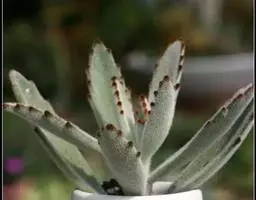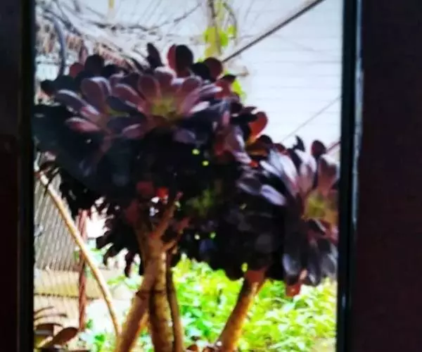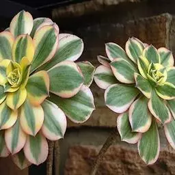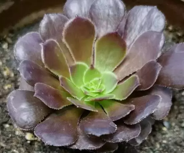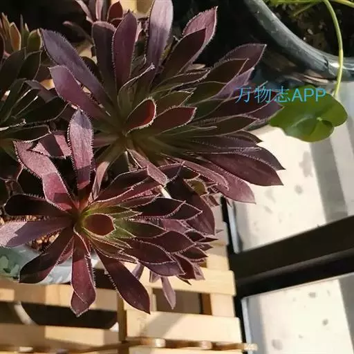 叶稍薄,在枝头集成20厘米的菊花形莲座叶盘,叶片倒长卵形或倒披针形,长5厘米-7厘米,顶端有小尖,叶缘有白色睫毛状细齿,叶色黑紫,冬季则为绿紫色。总状花序,长约10厘米,小花黄色,花后植株通常枯死。适宜放在家里。