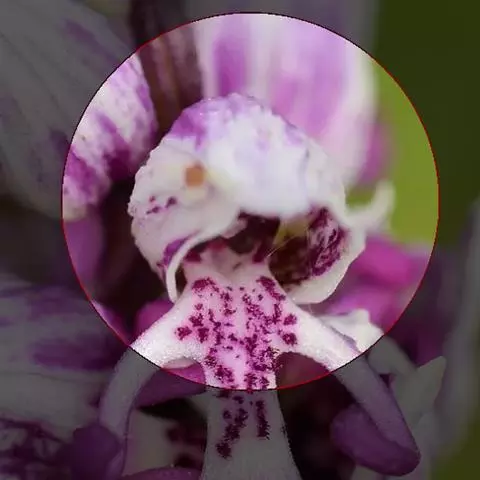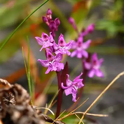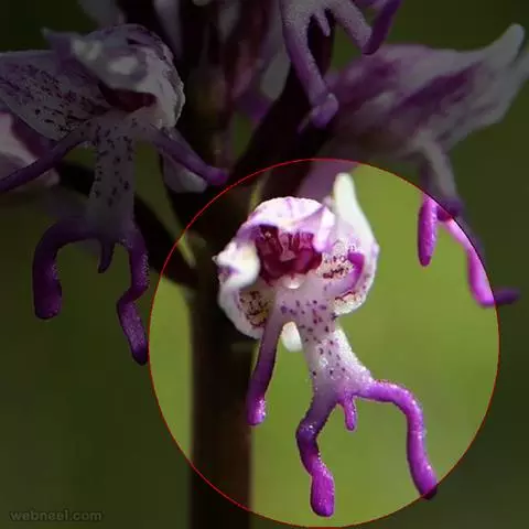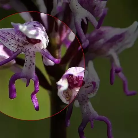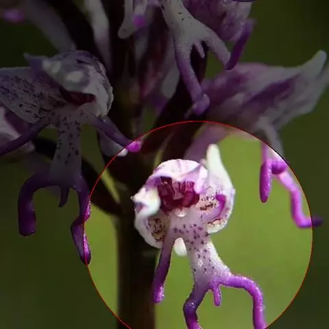 植株高6-10厘米。块茎小,卵球形或圆球形,长约5毫米,肉质。茎纤细,直立或近直立,基部具1-2枚筒状鞘,下部光滑,在近基部至中部具1枚叶,顶生1朵花。叶片披针形、倒披针状匙形或狭长圆形,长2-3厘米,宽6-10毫米,先端急尖或钝,基部收狭成抱茎的鞘。花苞片线状披针形,先端急尖,较子房长,但短于花;子房纺锤形,扭转,无毛,连花梗长6-11毫米;花中等大,淡紫色,粉红色或白色,具紫色斑点;萼片先端钝,具1脉,中萼片直立,凹陷呈舟状,狭卵形,长4毫米,下部宽1.6毫米;侧萼片狭长圆状椭圆形,长约5毫米,宽约1.6毫米;花瓣直立,斜卵形,与中萼片等长而较宽,并与中萼片相靠合,具1脉;唇瓣向前伸展,张开,内面被短柔毛,长、宽均约8毫米,近基部收狭成短爪,基部具距,中部之下3裂,侧裂片楔状长圆形,先端截形或钝,边缘全缘或微波状,中裂片倒卵形,较侧裂片宽多,先端凹缺呈2浅裂,边缘全缘或微波状;距圆筒状,下垂,长3-4毫米,末端钝,长为子房的1/3或1/2;蕊柱短,直立;花药近球形,直立,药室基部靠近,顶部叉开;花粉团近球形,具花粉团柄和粘盘,粘盘卵形;蕊喙小,三角形,直立;柱头2个,隆起,近四方形;退化雄蕊2个,小,圆形。花期7-8月。