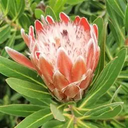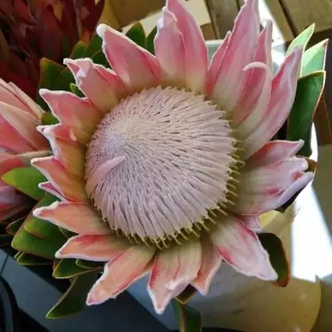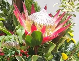 帝王花,山龙眼科帝王花属多年生常绿灌木植;茎干粗壮,叶色翠绿光亮;花朵呈圆球状;其苞片有的完全打开,…