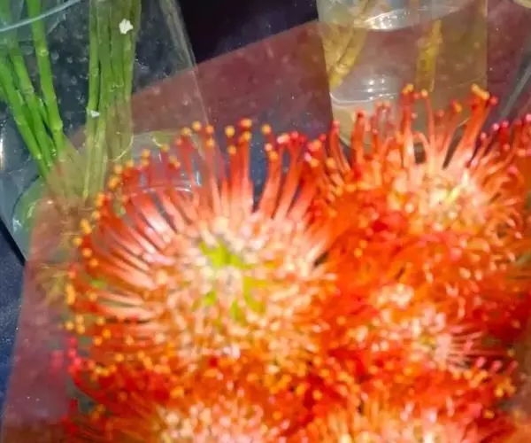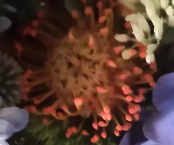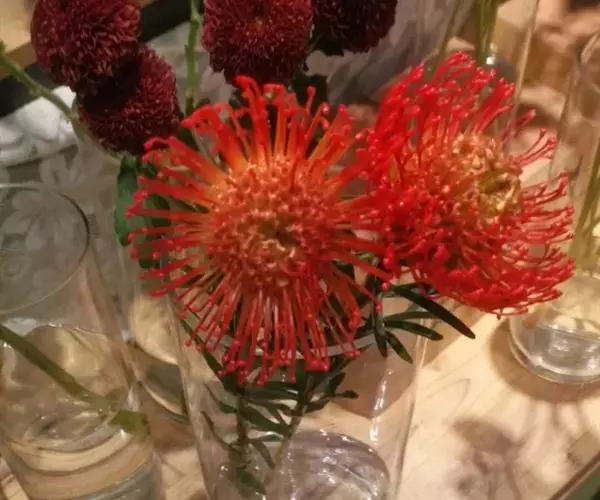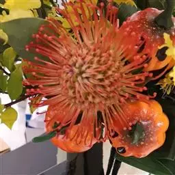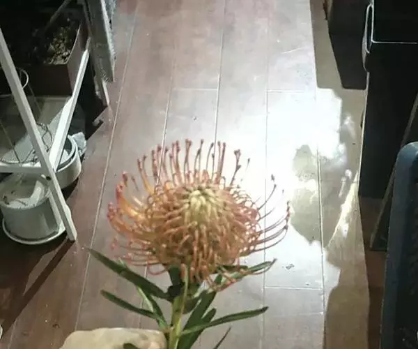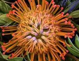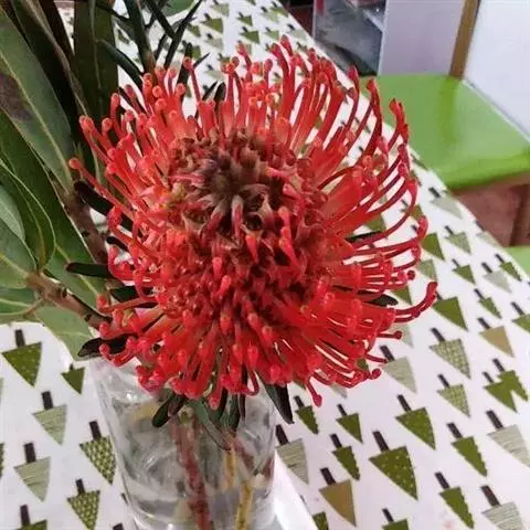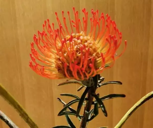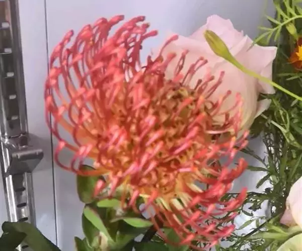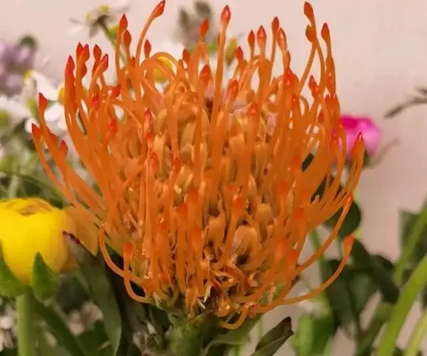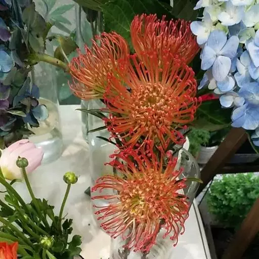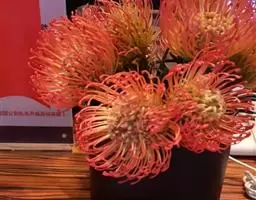 针垫花(Leucospermum sp.)又名风轮花、针包花、针垫山龙眼等。全属植物约50多种,主要分布在南非和津巴布韦等地。常绿蔓性灌木,少数为小乔木,叶轮生,硬质,多为针状、心脏形或矛尖状,边缘或叶尖有锯齿;花序密集,头状花序,单生或少数聚生;花冠小,针状。从它的植物学特征的描述可以看出这种植物有些古老和原始。如今的针垫花是通过众多的鲜花布景被世界各地的游人认识,从而走出国门,并分布于世界的每一个角落,成为一个非常流行的园艺品种,也被广泛用作鲜切花。