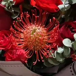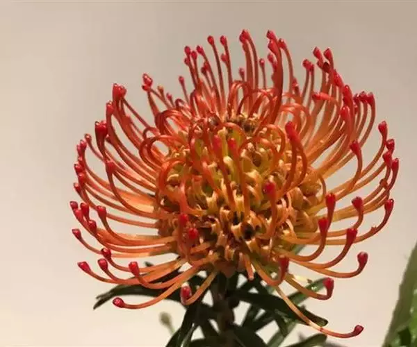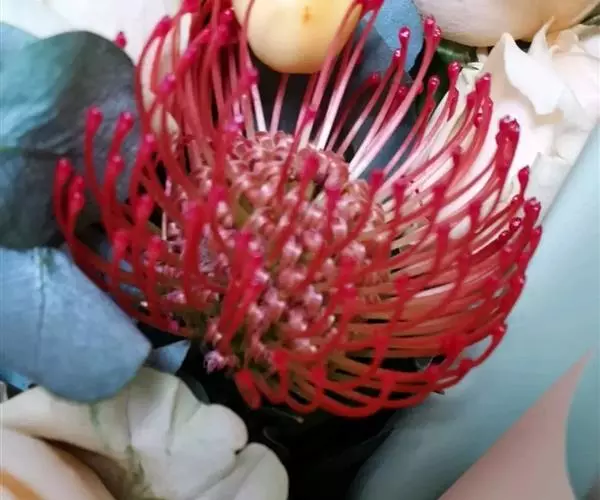 针垫花(Leucospermum sp.)又名风轮花、针包花、针垫山龙眼等,属于山龙眼科针垫花属(Leucospermum)植物。全属植物约50多种,主要分布在南非和津巴布韦等地。常绿蔓性灌木,少数为小乔木,叶轮生,硬质,多为针状、心脏形或矛尖状,边缘或叶尖有锯齿;花序密集,头状花序,单生或少数聚生;花冠小,针状。从它的植物学特征的描述可以看出这种植物有些古老和原始。确实,针垫花是南非本土的植物品种,生长在酸性、贫瘠的土壤环境中,在冬季多雨季节和炎热、干燥的夏季开花。据说,在南非开普角保护区还遗存有世界上为数不多的金黄色针垫花,成为植物王国里不可多得的活化石。如今的针垫花是通过众多的鲜花布景被世界各地的游人认识,从而走出国门,并分布于世界的每一个角落,成为一个非常流行的园艺品种,也被广泛用作鲜切花。