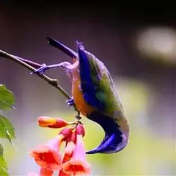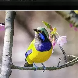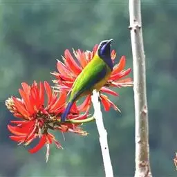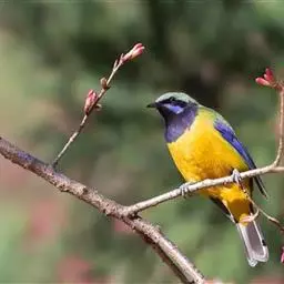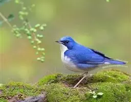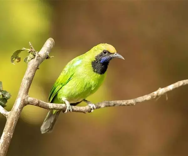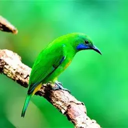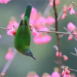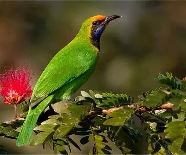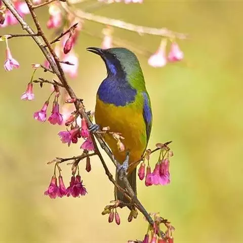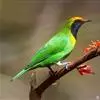 蓝翅叶鹎:小型鸟类,体长15-18厘米。雄鸟通体草绿色,尾蓝绿色,肩和翅亮蓝 色,胸缀有黄色,…