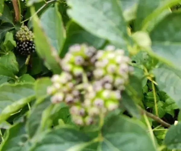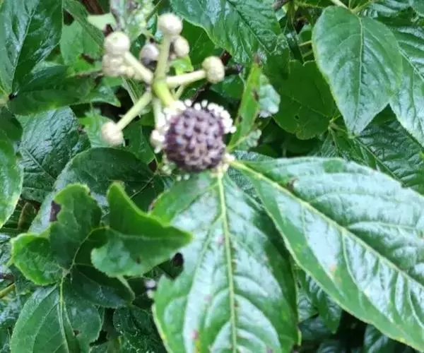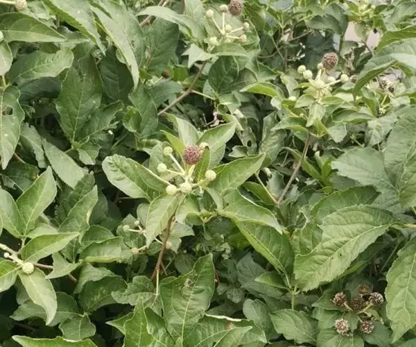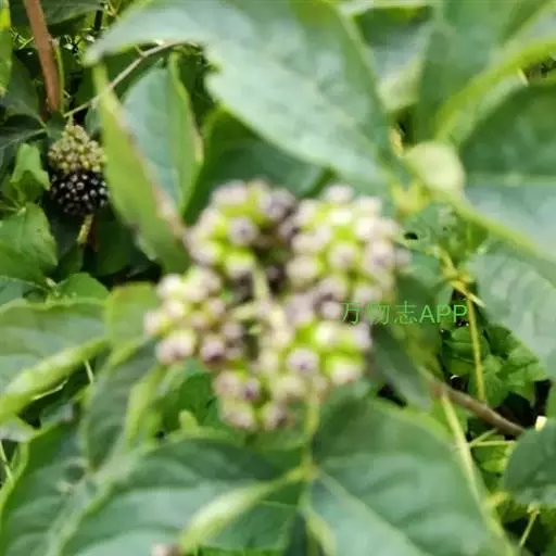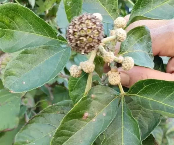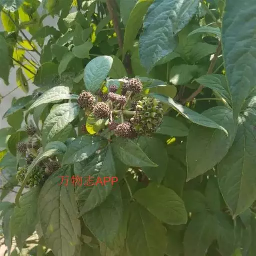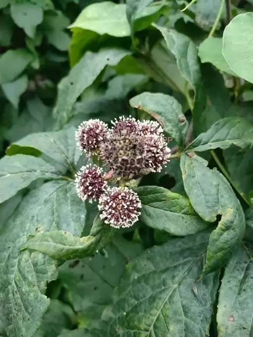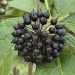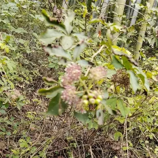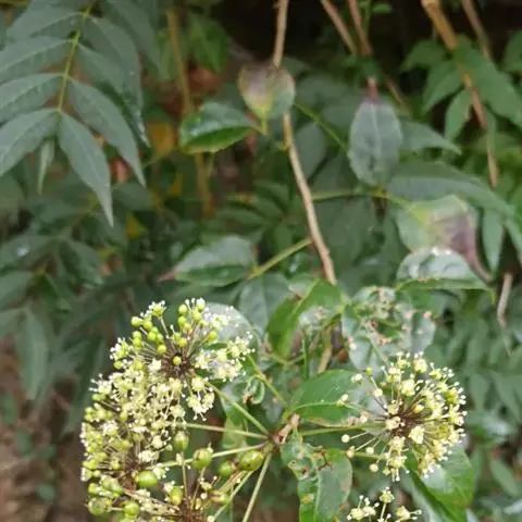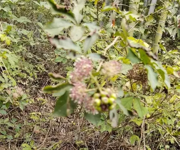 头状花序紧密,球形,直径2-3.5厘米,有花多数,5-6个稀多至10个组成顶生圆锥花序或复伞形花序;总花梗长0.5-3厘米,密生短柔毛;花无梗;萼密生白色绒毛,边缘有5小齿;花瓣5,卵形,浓紫色,长1.5-2毫米,外面有短柔毛,后毛脱落;子房2室,花柱全部合生成柱状,柱头离生。果实倒卵状椭圆球形,黑色,长1-1.5厘米,稍有棱,宿存花柱长达3毫米。花期8-9月,果期9-10月。