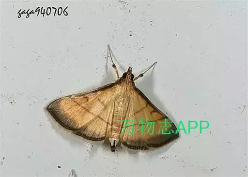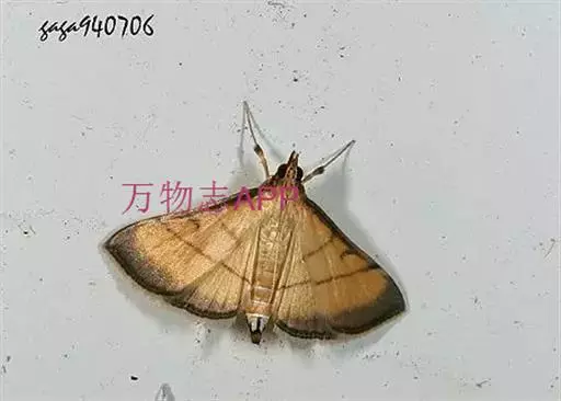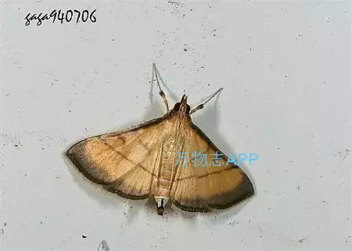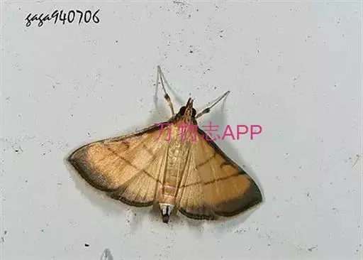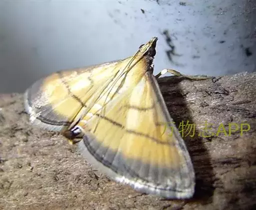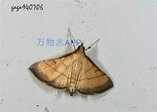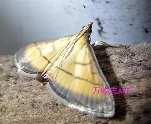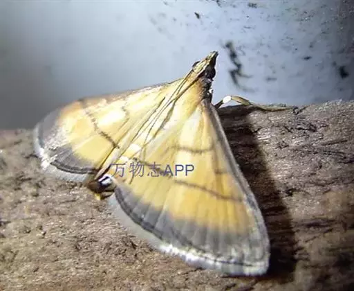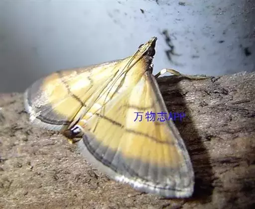稻纵卷叶螟成虫图 成虫 成虫体长7~9毫米,翅展12~18毫米。体、翅黄褐色,停息时两翅斜展在背部两侧。复眼黑色,触角丝状,黄白色。前翅近三角形,前缘暗褐色,翅面上有内、中、外三条暗褐色横线,内、外横线从翅的前缘延至后缘,中横线短而略粗,外缘有一条暗褐色宽带,外缘线黑褐色。后翅有内、外横线二条,内横线短,不达后缘,外横线及外缘宽带与前翅相同,直达后缘。腹部各节后缘有暗褐色及白色横线各一条,腹部末节有二个并列的白色直条斑。雄蛾前翅前缘中部稍内方,有一中间凹陷周围黑色毛簇的闪光“眼点·,中横线与鼻眼点,相连;前足跗节膨大,上有褐色丛毛,停息时尾节常向上翘起。雌蛾前翅前缘中间,即中横线处无。眼点",前足咐节上无丛毛,停息时,尾部较平直。