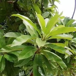 常绿乔木,高25米,胸径宽约1米,树皮红褐色,平滑,大块薄片状脱落;嫩枝粗壮,有褐色柔毛,老枝秃净,有明显的叶柄痕迹。叶薄革质,矩圆形或倒卵状矩圆形,长15-40厘米,宽7-14厘米,先端近于圆形,有长约1厘米的短尖头,基部广楔形,不等侧,上下两面初时有柔毛,不久变秃净,仅在背脉上有毛,侧脉25-56对,干后在上下两面均突起,脉间相隔5-8毫米;第二次支脉近于平行,与第一次侧脉斜交,脉间相隔2毫米,在下面与网脉均稍突起,边缘有明显锯齿,齿尖锐利;叶柄长5-7厘米,有狭窄的翅,基部稍扩大,多少被毛。