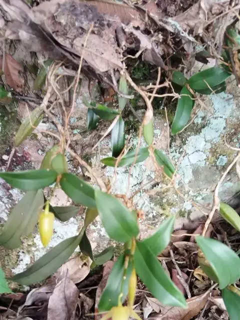 广东石斛:茎直立或斜立,细圆柱形,不分枝,具少数至多数节。叶革质,二列、数枚,互生于茎的上部,狭长…