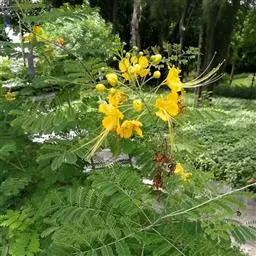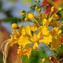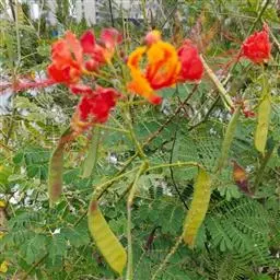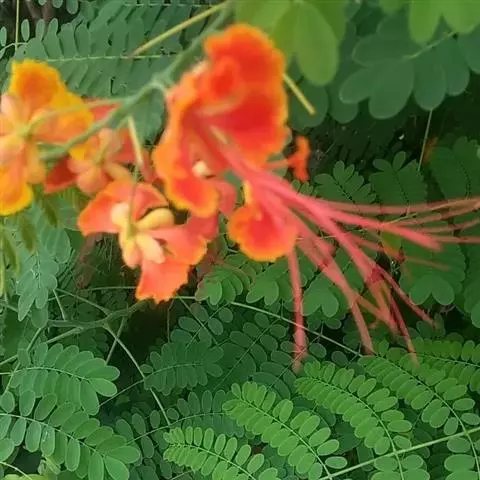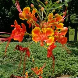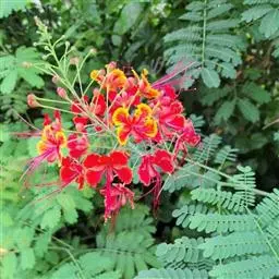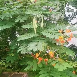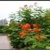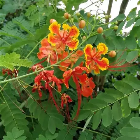 洋金凤 Sw.),豆科小凤花属灌木状或小乔木植物,枝无毛,绿或粉绿色;二回羽状复叶;总状花序伞房状,…