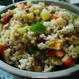 什锦炒饭是一道色香味俱全的名点,以江苏扬州的炒饭最知名。虾仁去泥肠洗净,加料酒、胡椒粉、淀粉上浆。胡萝卜洗净,切小片。蘑菇洗净、切块。将虾仁、豌豆粒、蘑菇倒入沸水锅中,焯烫至断生,捞出沥水。炒锅中加入少许食用油,放入胡萝卜片煸炒片刻,再放入虾仁、豌豆粒、蘑菇加盐、鸡精、胡椒粉炒匀,接着倒入熟米饭搅拌均匀,盖锅盖焖3分钟后,即可盛盘。