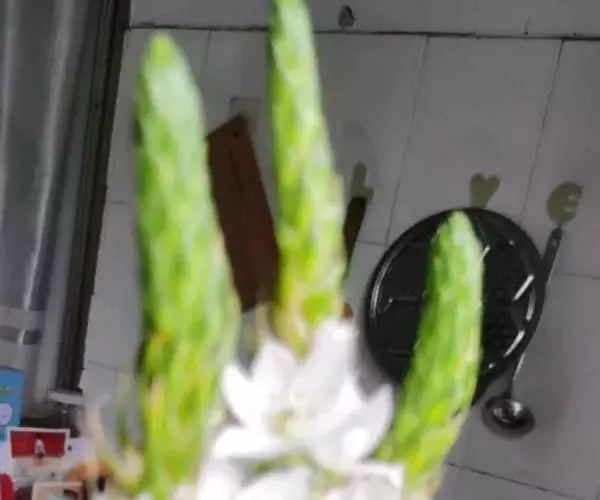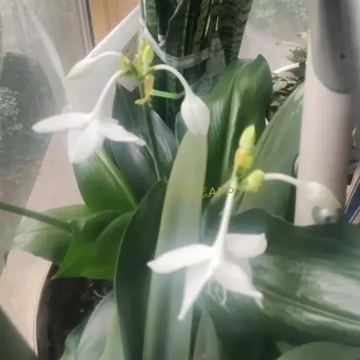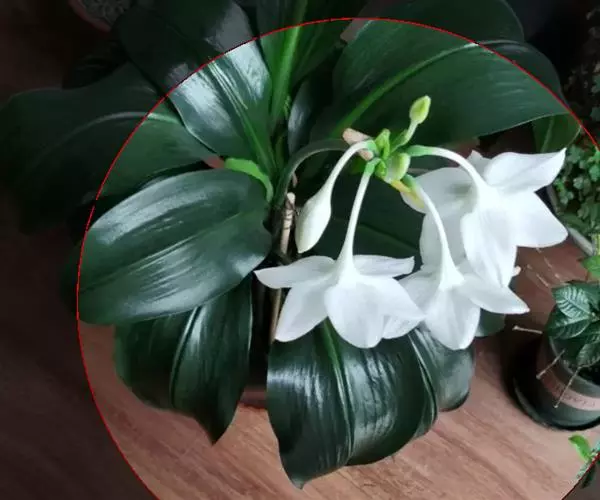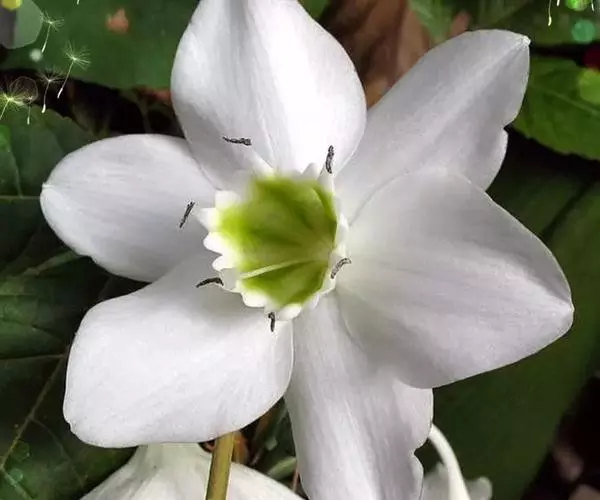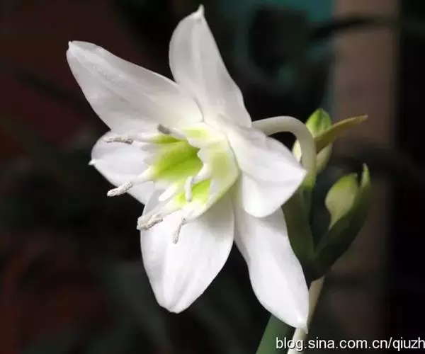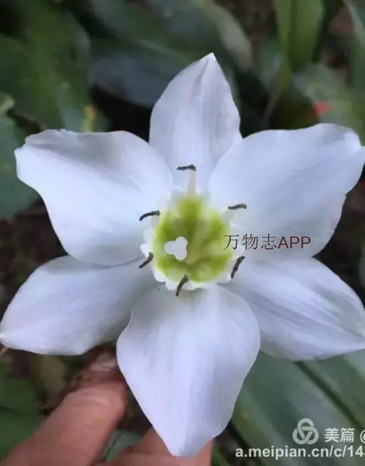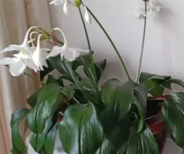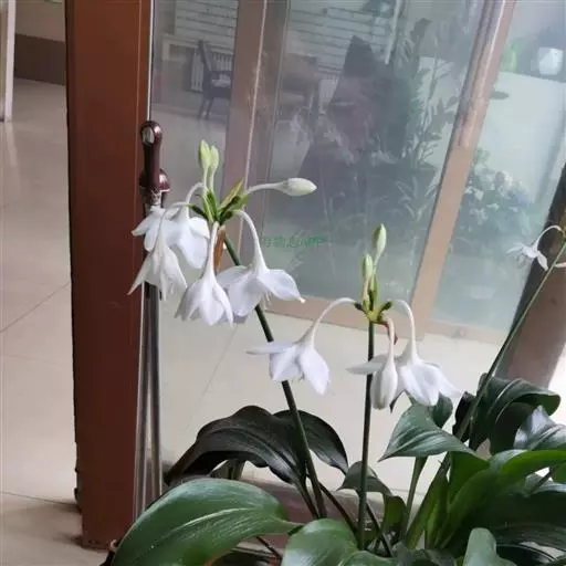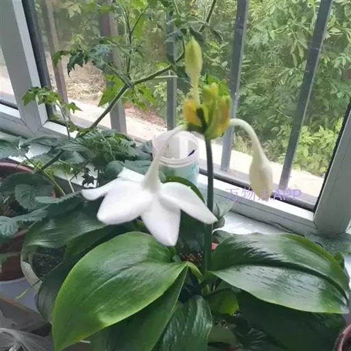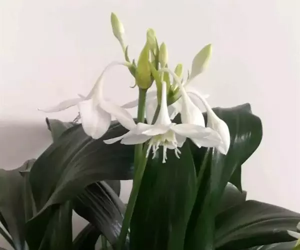 南美水仙是一种多年生鳞茎花卉,叶片肥大嫩绿,花白色,是室内盆栽观赏植物。
