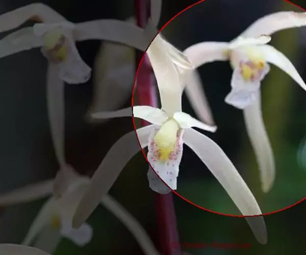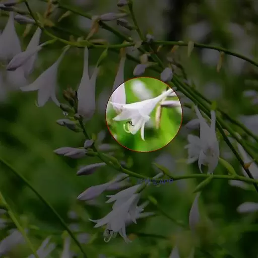 侧枝节间抽生花葶,伞状花序。花葶圆柱形,直径1.5厘米,长约50-60厘米,萼片3枚,蕾期白绿色。每葶着花5-7朵、佛焰苞纸质,外佛焰苞片2枚,卵状披针形,内佛焰苞片多数、丝状。雄蕊6枚合生于副冠,雌蕊一枚高于雄蕊。花被长约4.5厘米,花冠直径为10厘米,花蕾绿色,开放后白色,副冠浅杯状,底部含绿色斑纹,状若翡翠玉盘。