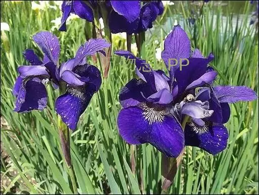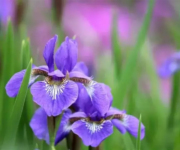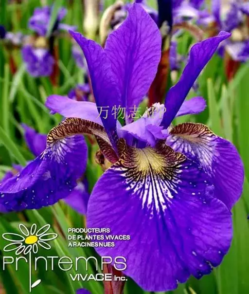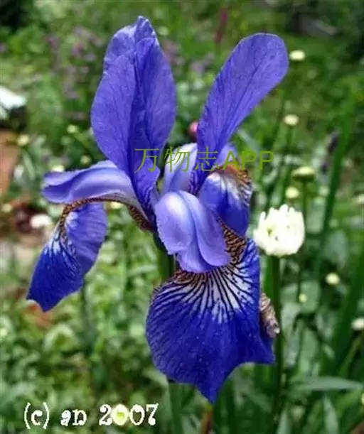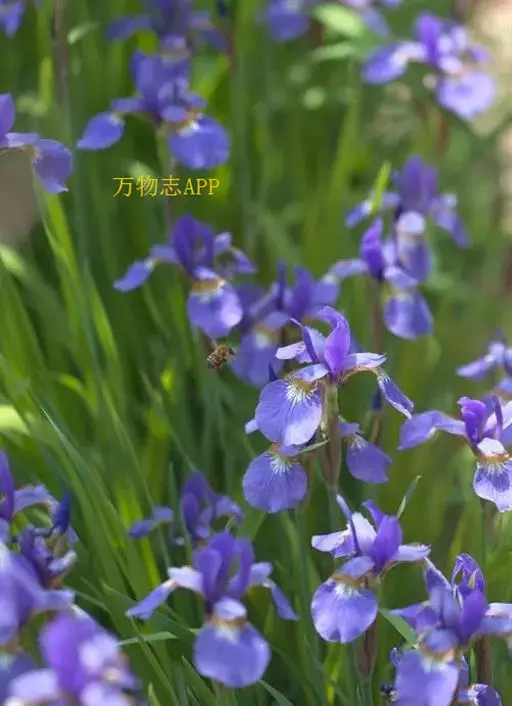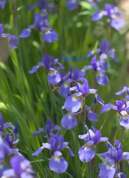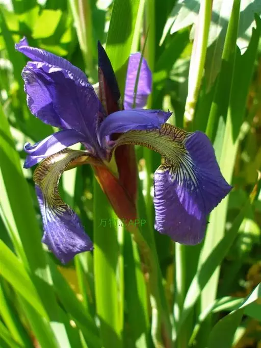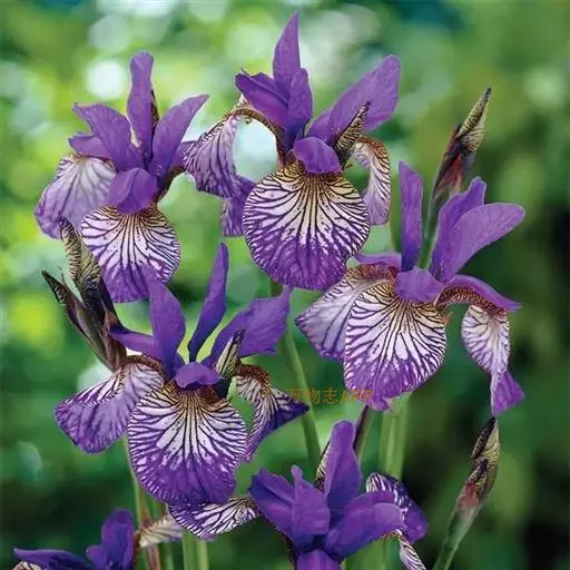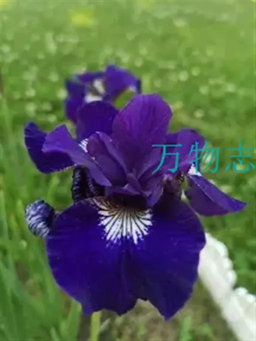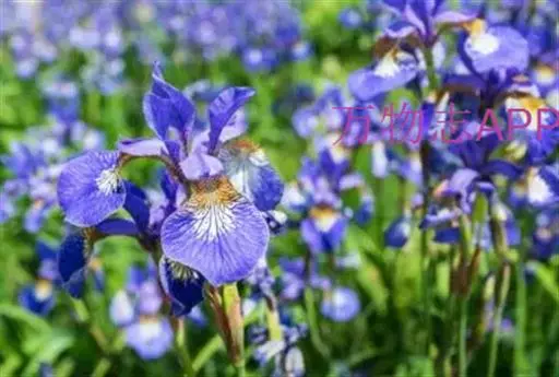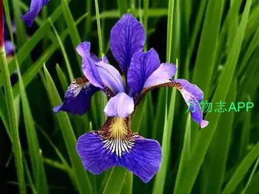 西伯利亚鸢尾(学名:Iris sibirica L.):多年生草本植物,植株基部围有鞘状叶及老叶残留的纤维。根状茎粗壮,斜伸;须根黄白色,绳索状,有皱缩的横纹。叶灰绿色,条形,顶端渐尖。花茎高于叶片,平滑,高40-60厘米,有1-2枚茎生叶;苞片3枚,膜质,绿色,边缘略带红紫色,狭卵形或披针形,顶端短渐尖,内包含有2朵花。花蓝紫色;外花被裂片倒卵形,上部反折下垂,内花被裂片狭椭圆形或倒披针形,直立。蒴果卵状圆柱形、长圆柱形或椭圆状柱形,无喙。花期4-5月,果期6-7月。